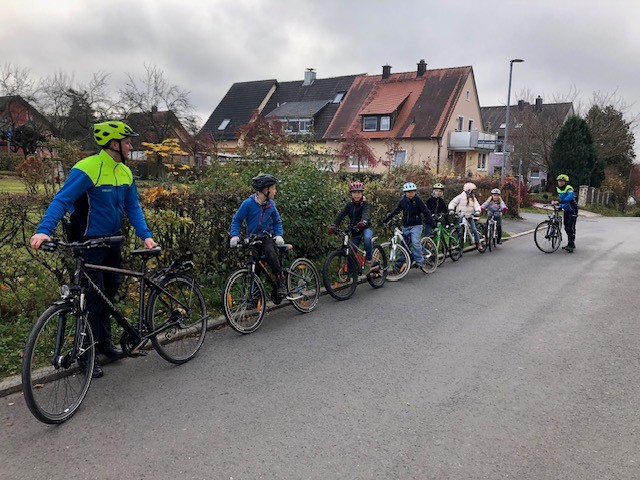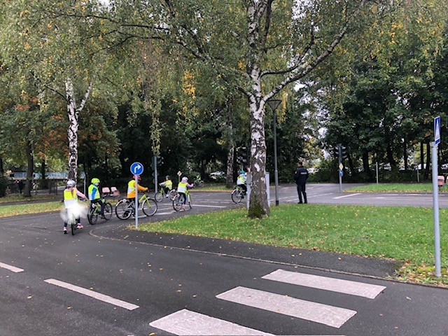 Die 4. Klasse beim Üben mit dem Fahrrad auf dem Verkehrsübungsplatz mit den Verkehrspolizisten Frau …